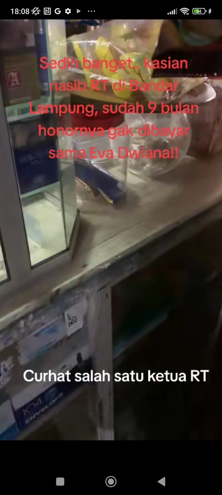 “Yang bener sih bang, hutang gua segini sih bang? Gaji RT ini sudah sembilan bulan bang belum dibayar sama Bunda Eva. Anak bini gua di rumah sengsaro bang gara-gara Eva ini bang,” keluh ketua RT, Senin (19/6).